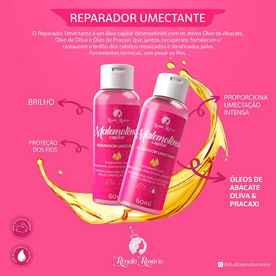 O Reparador Umectante é um óleo capilar desenvolvido com os ativos Óleo de Abacate, Óleo de Oliva e Óleo de Pracaxi que, juntos, recuperam, fortalecem e restauram o brilho dos cabelos, ressecados e danificados pelas ferramentas térmicas, sem pesar os fios.